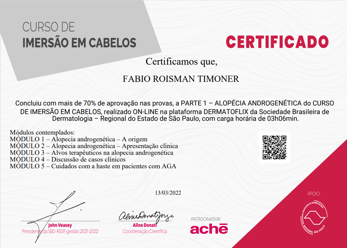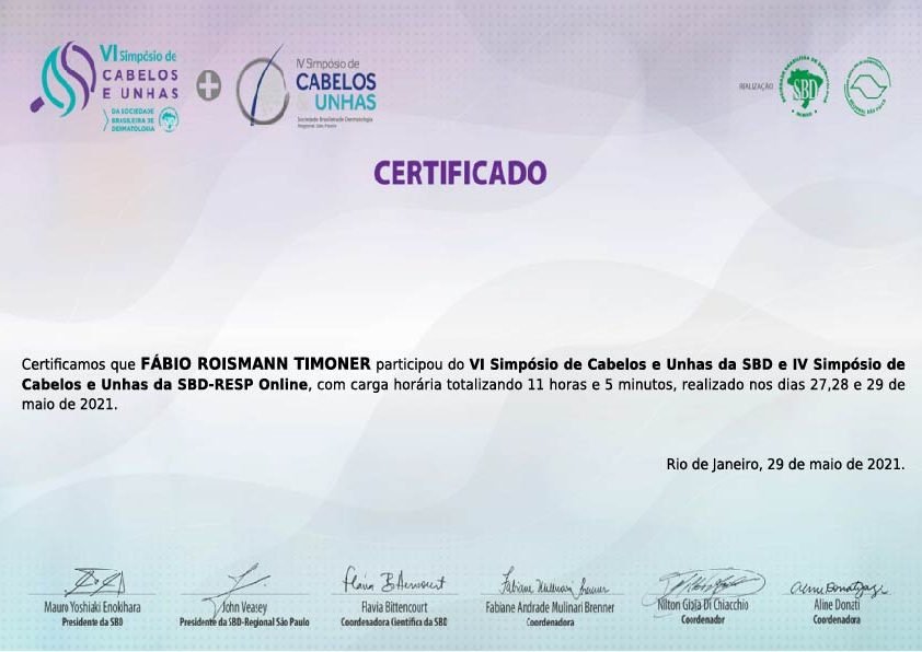 Dr FABIO TIMONER em atualização constante CERTIFICADO CABELOS E UNHAS