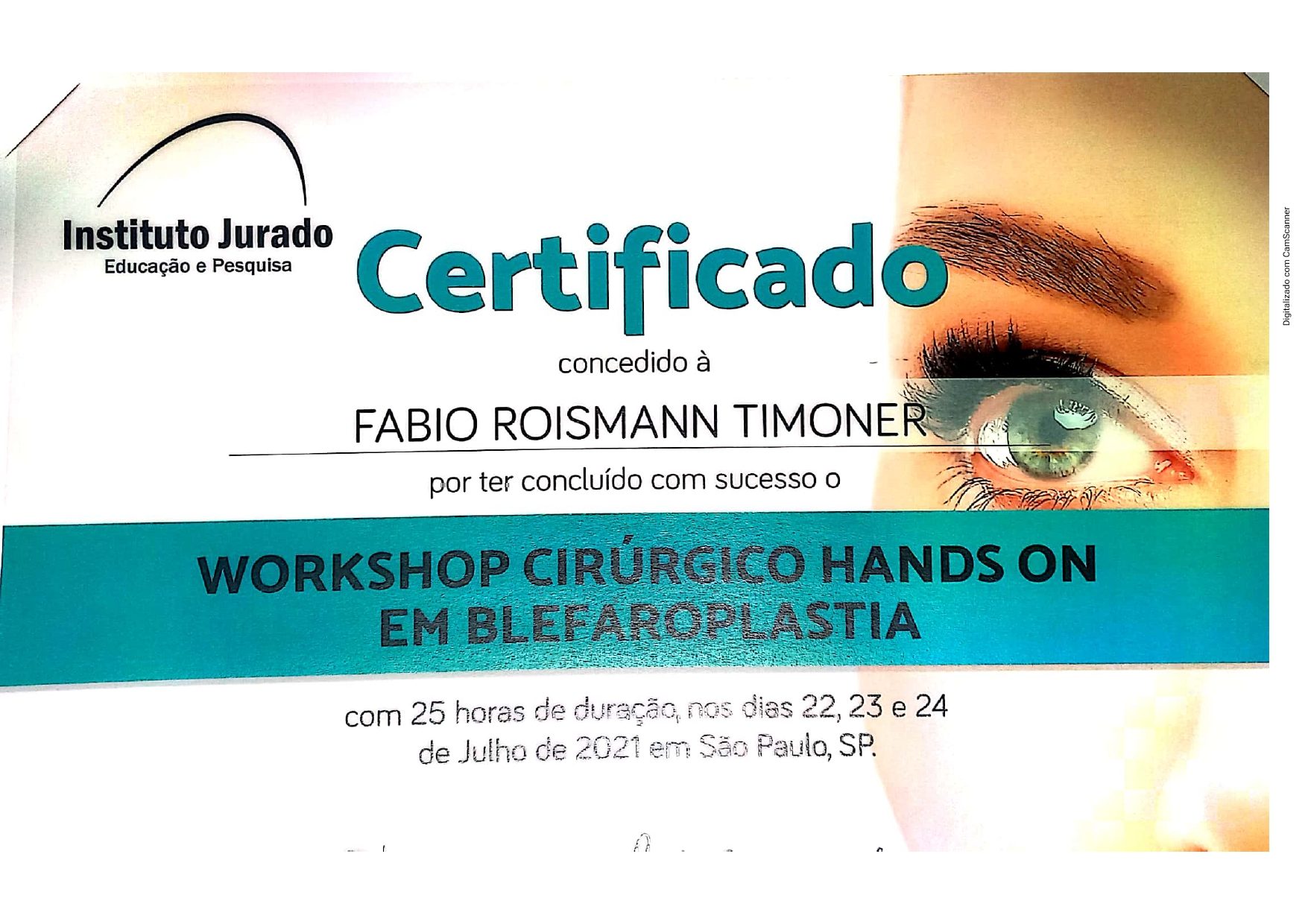 Dr FABIO TIMONER em atualização constante CERTIFICADO HANDS ON – Blefaroplastia